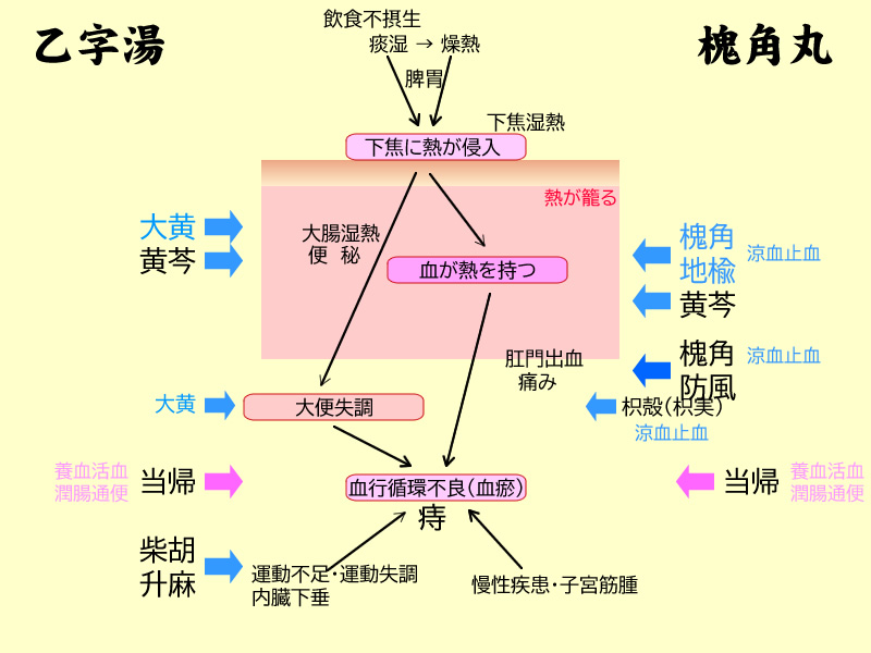 こちらの場合は「飲食不摂生」からスタートしています、例えば、お酒を飲みすぎたのでしょうか。脾胃に痰湿が入り、徐々に下に熱が向かっていきます。便秘になり局所が圧迫され血液循環不良が生じて痔になる場合もありますし、熱が深く入り血(けつ)にまで届き、血瘀が生じて肛門出血・痛み(痔)になる場合もあります。